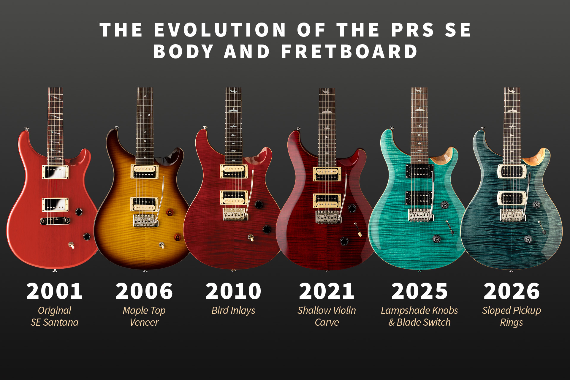 The SE Series was first introduced in 2001 with the launch of the SE Santana. Over the last 25 years we have grown our SE offerings to include over 20 models, and made several improvements to the specs and features of the SE Series as our goal has always been to give players an affordable option without compromising the quality of the instrument. In this blog let's take a deeper look at some of the changes we've made over the years, ranging from the addition of Paul Reed Smith's name on the headstock, to our latest pickup ring and tuning peg appointments.