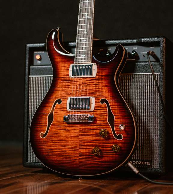 Boasting an LR Baggs/PRS Piezo system, the SE Hollowbody II Piezo provides musicians with the versatility of wielding both acoustic and electric tones in one instrument. The instrument is designed with two discrete volume controls (magnetics and piezo) and output jacks (mix/piezo and magnetics). Players can plug into the “Mix/Piezo” jack and use the individual volume controls to blend the 58/15 LT “S” pickups with the piezo’s acoustic tones. Alternatively, players can plug into the jacks separately, so the guitar can run magnetic pickups into an amp and run the piezo through an acoustic amp or DI into the soundboard. When using the magnetic output jack in isolation, the piezo battery is bypassed completely, acting as a failsafe (in this scenario, the magnetic pickups still work even if the piezo battery has run out of juice).